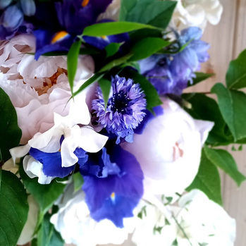 Mid blues look gorgeous amoungst the blush pink peonies.